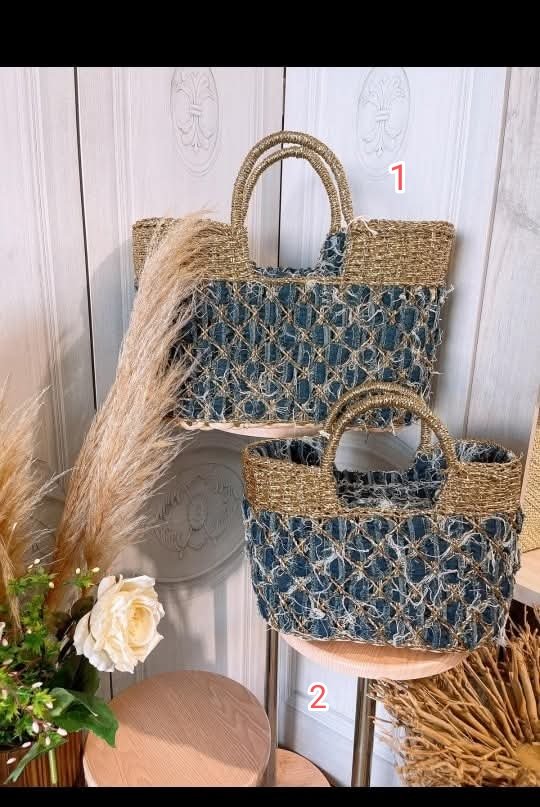 bolso de esparto Camel con azul . Hay Dos modelos.