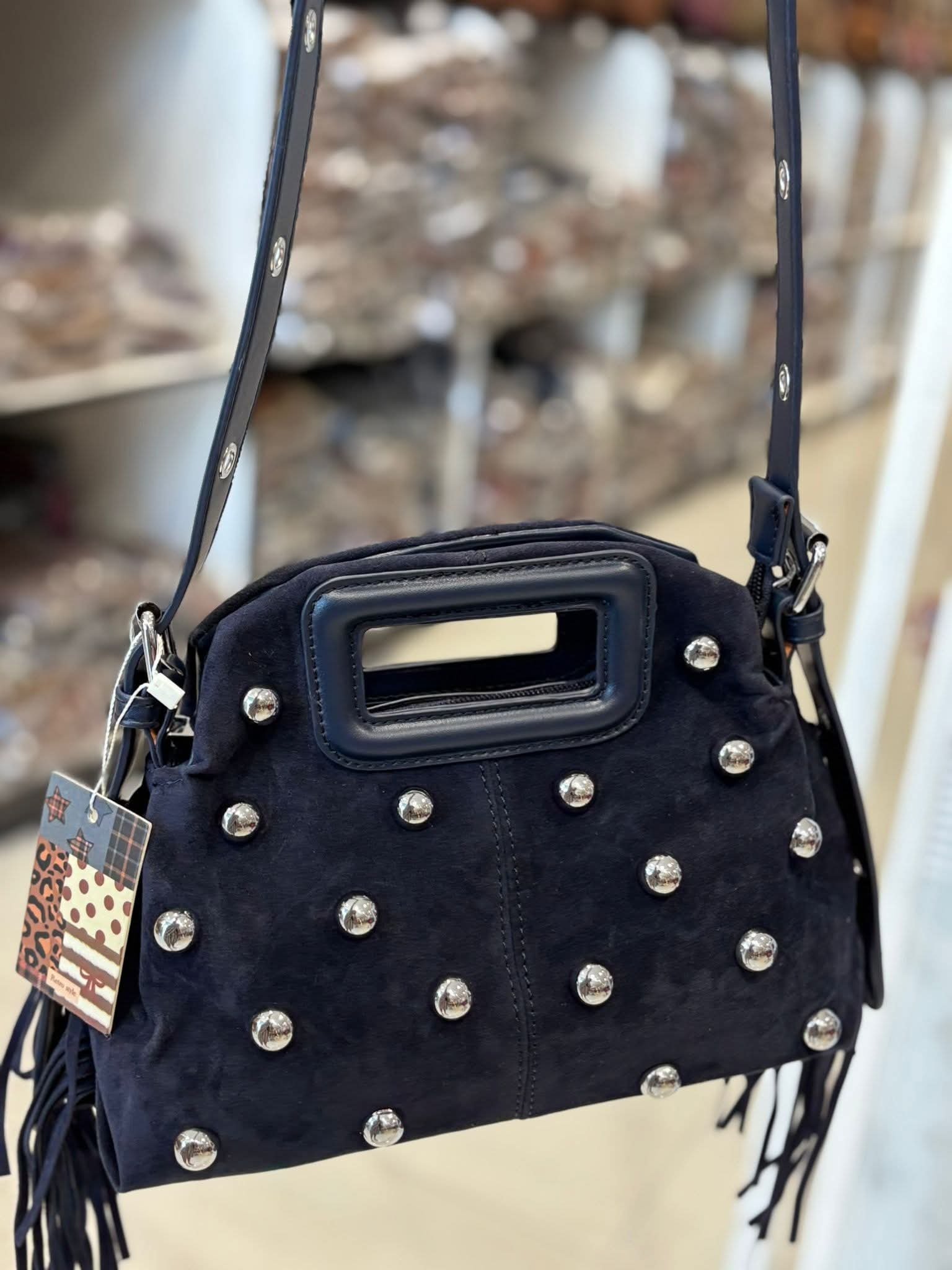 Bolso negro con tachuelas y flecos en los laterales. Único color.