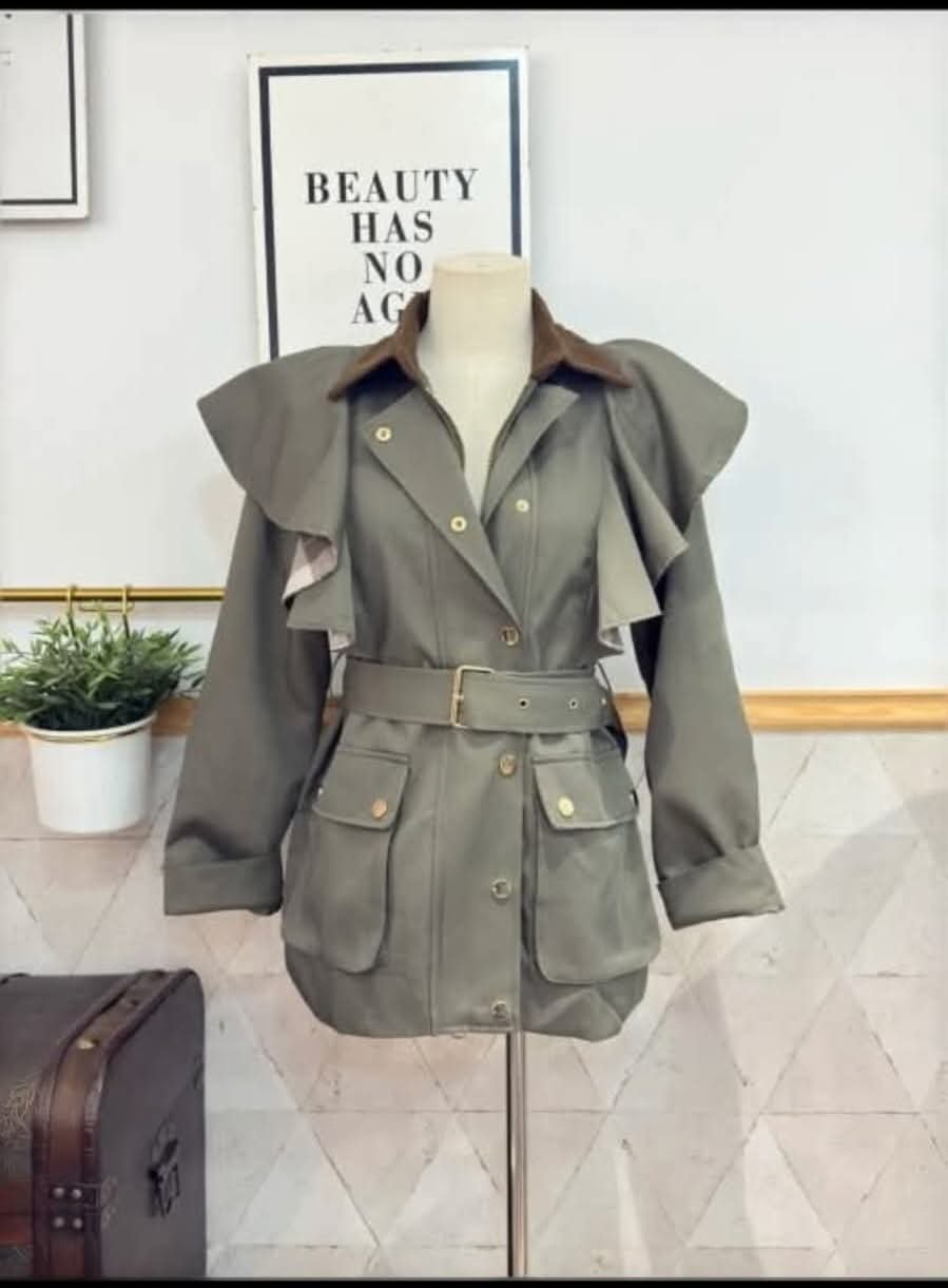 chaqueta verde kaki con cinturón y volantes en la parte del hombro . Viene por tallas.