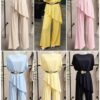 conjunto de pantalón y blusa con botones y cordón por la cintura.