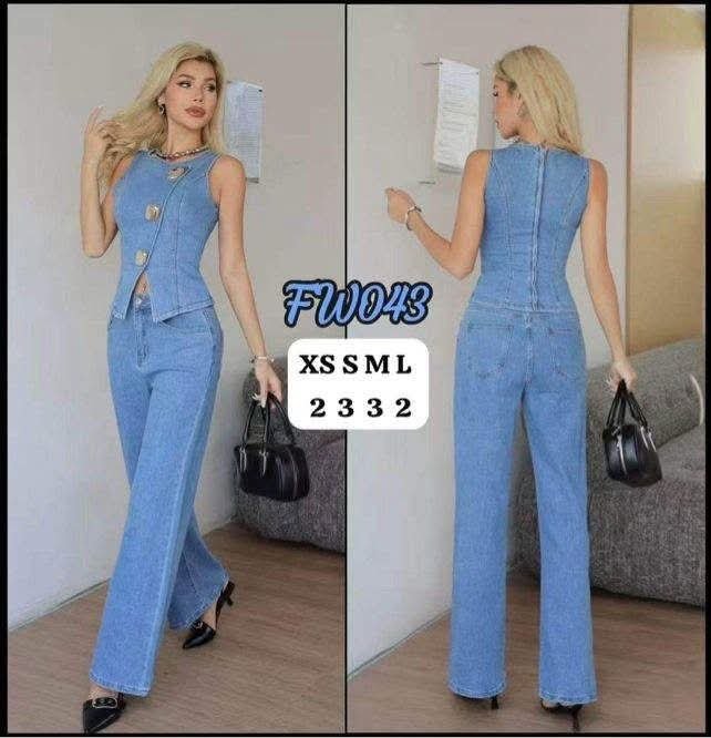 conjunto de pantalón y chaleco vaquero .El chaleco viene con cremallera en la parte trasera .Viene por tallas.
