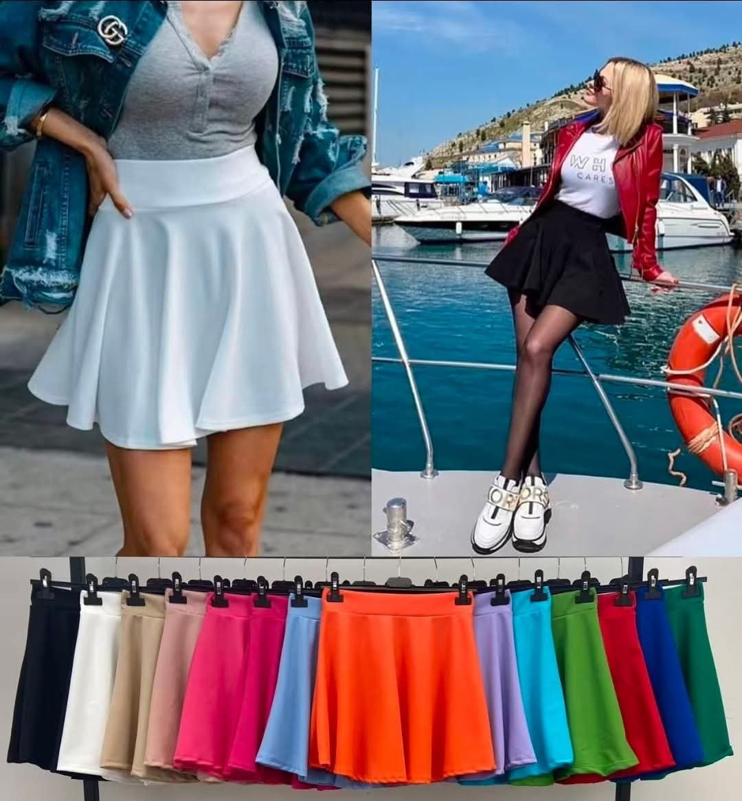 falda corta de vuelo. Talla única desde la 36 hasta la 40/42 aprox.Diferentes colores.POR FAVOR PONER EN NOTAS EL COLOR DESEADO.