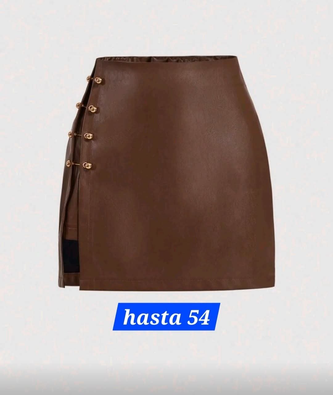 Skip to contentFalda pantalón de polipiel marrón con adornos dorados en el lateral.Talla única desde la 46 hasta la 54 aprox.