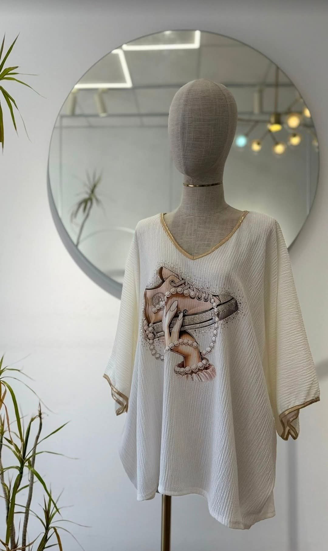 jersey blanco con dibujo en tonos rosas de una mano cogiendo una deportiva. Talla única desde la 46/48 hasta la 54/56 aprox.