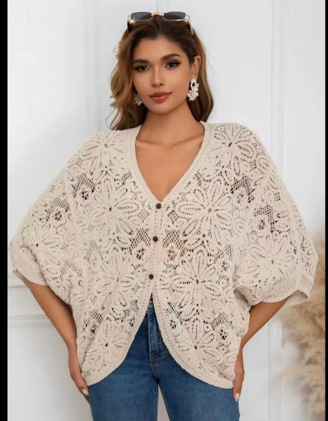 rebeca de crochet beige con botones .Talla única desde la 36 hasta la 46/48 aprox.