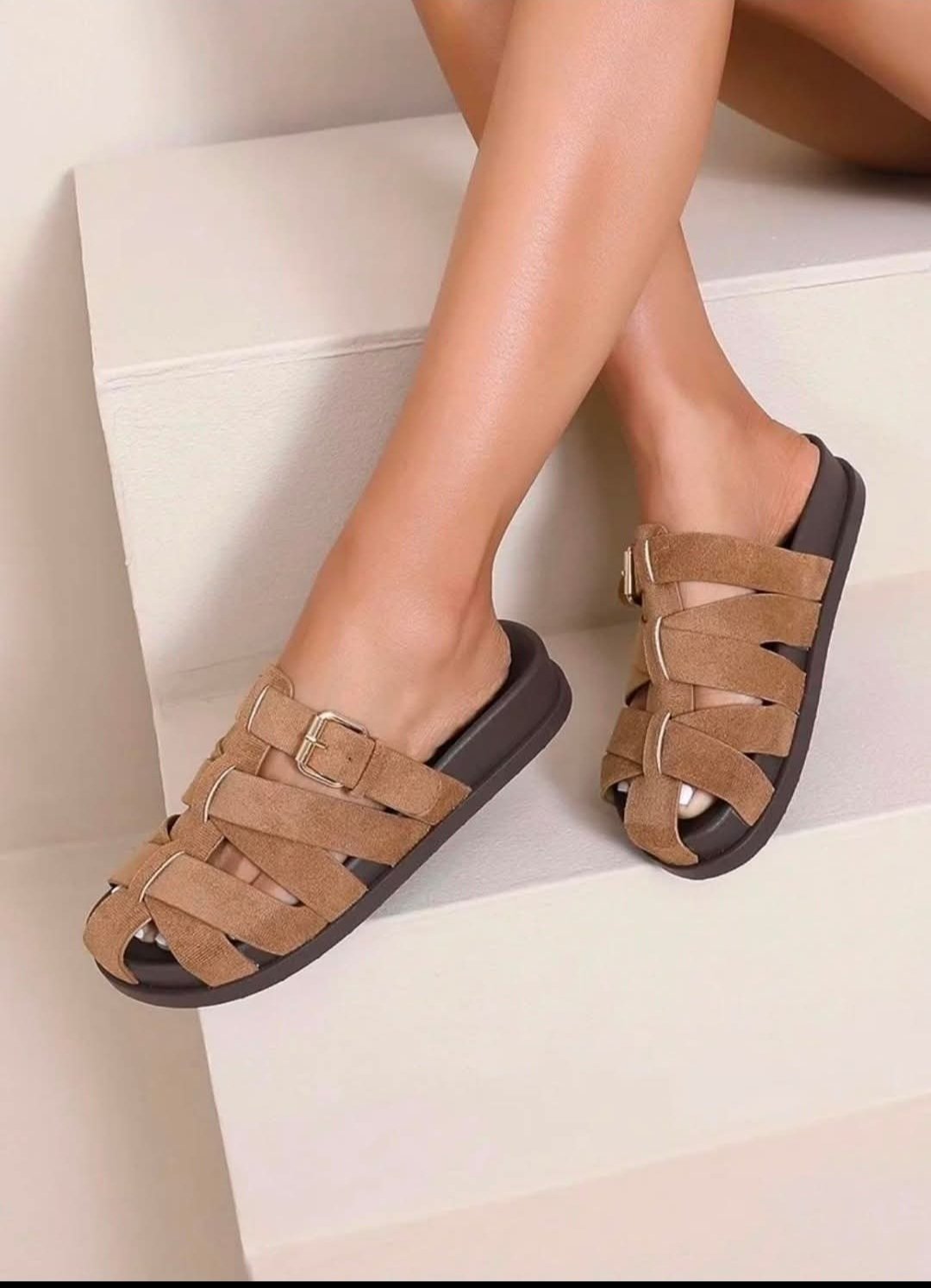 sandalia de tiras en tonos Camel con una hebilla de adorno en el lateral. Todos los números.