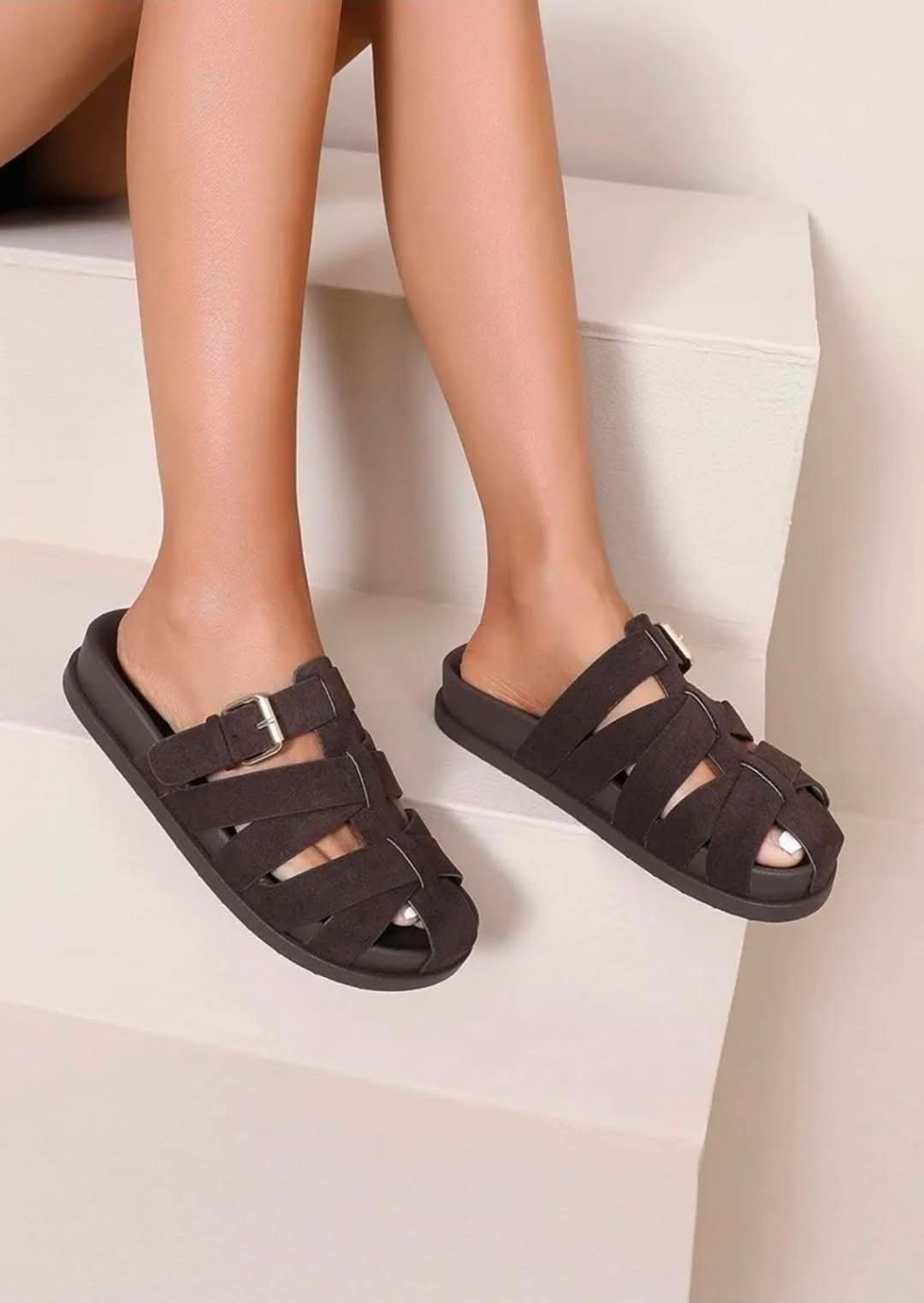 sandalia de tiras en color marrón chocolate con una hebilla en el lateral. Todos los números.