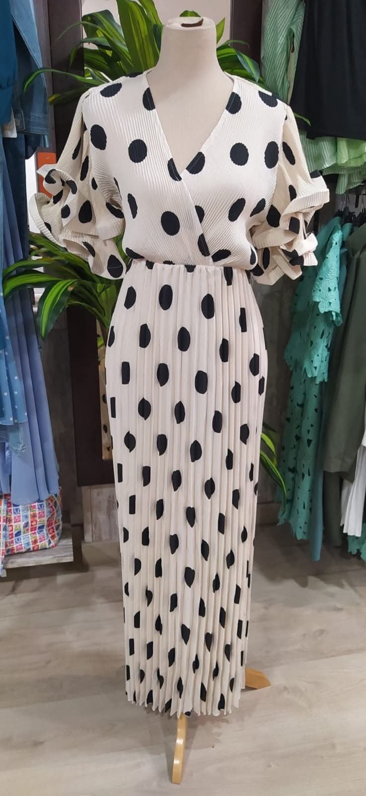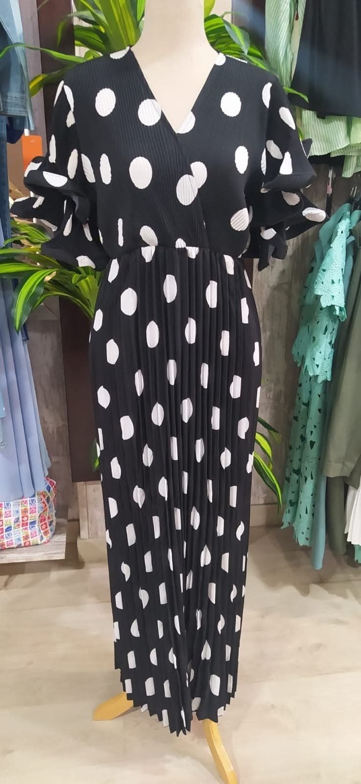 vestido de lunares con elástico en la cintura y manga con volantes.Viene en Dos colores y talla única desde la 36 hasta la 46 aprox.